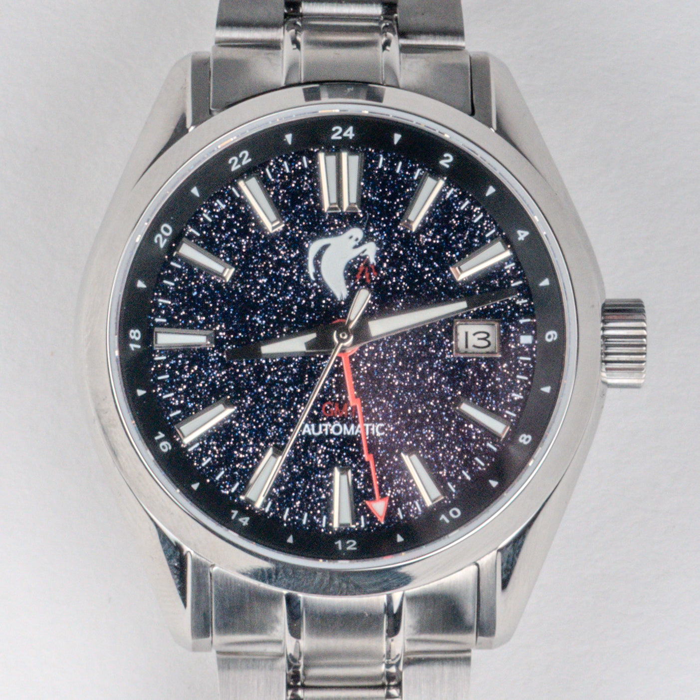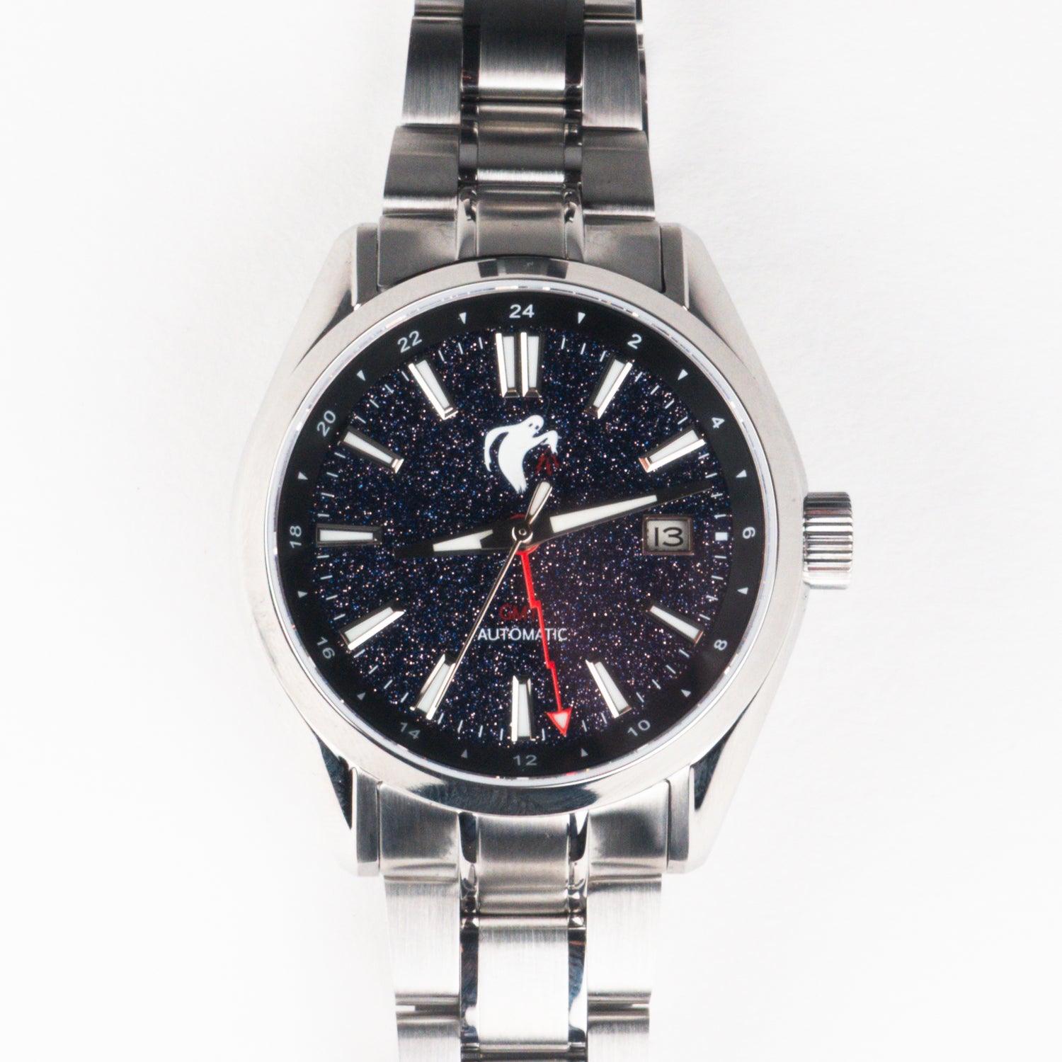 The dark blue aventurine dial shimmers like a starry night sky, its surface alive with depth and brilliance. Anchoring the design is the glowing Ghost Army insignia below 12 o’clock and a bold red lightning bolt GMT hand, allowing precise tracking of a second time zone with true GMT functionality.