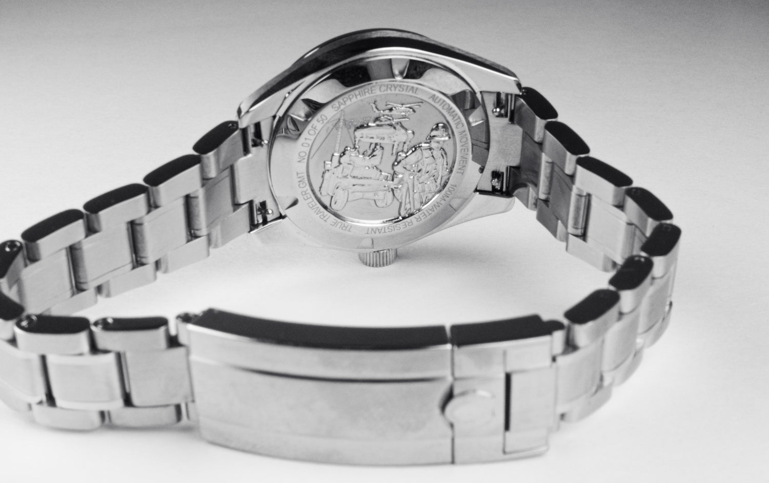 The case back’s commemorative molding depicts PSYOP soldiers across eras, from the WWII Ghost Army to Vietnam and into modern-day operations. Each is etched with its unique number—one of only 50 —surrounded by specifications noting the sapphire crystal, GMT automatic movement, and 100m water resistance.